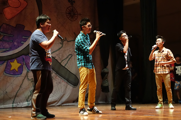 ↓AIP14级B班新生,四个小伙演唱的《月半小夜曲》得到在场观众的热烈欢呼。