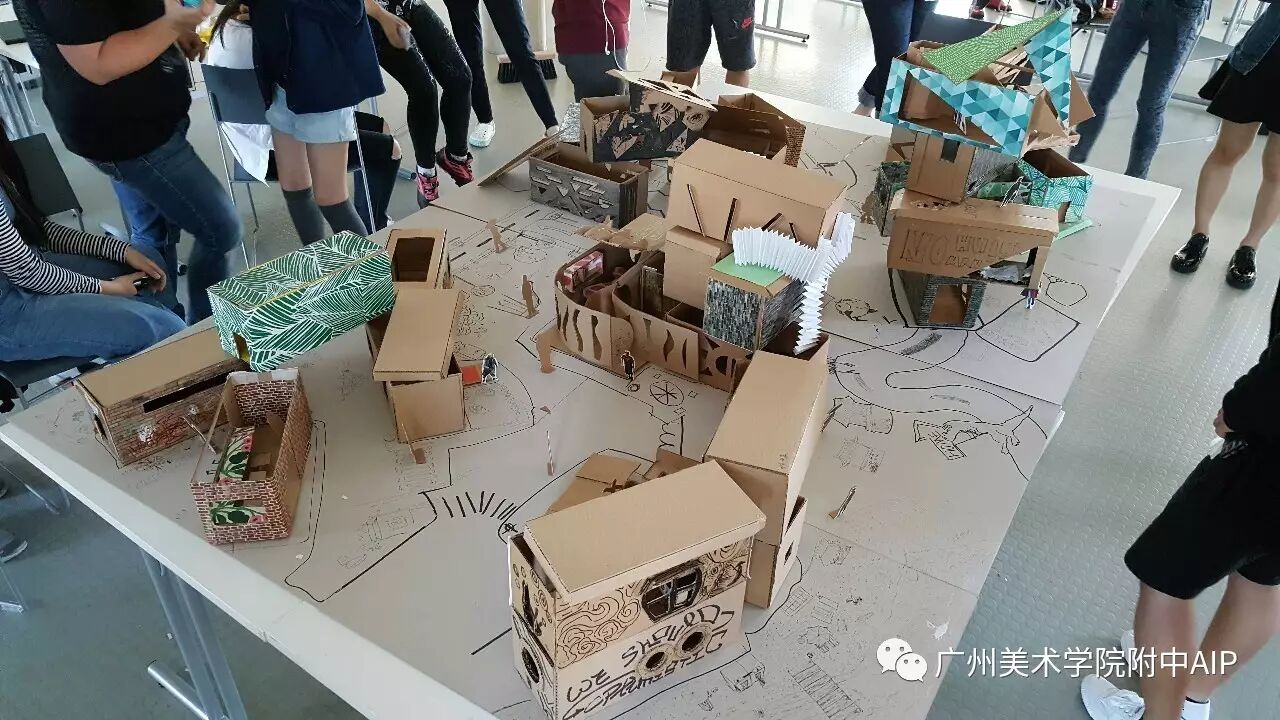 建筑空间体验课上,AUB的老师要求同学们分好小组,运用平时生活中十分常见的纸板、纸箱作为原材料,融入自己的绘画和创意,创作作为城市一部分的集装箱,最后通过小组合作完成共同的集装箱City。