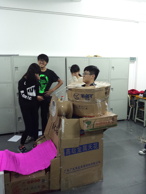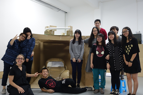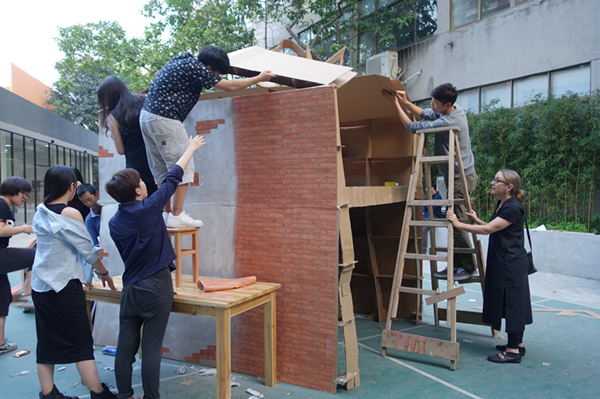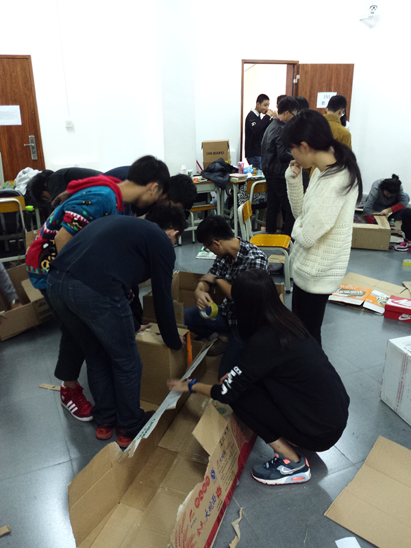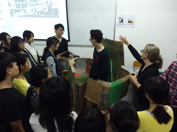 在Carol老师指导下,学生们通过纸皮箱来进行改造,搭建出一个建筑模型。