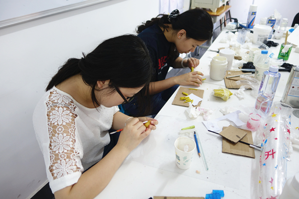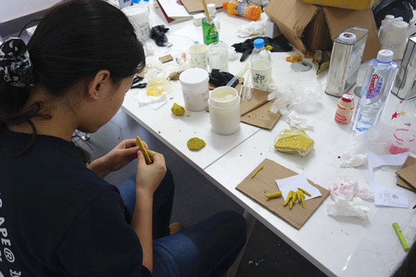 预科班珠宝设计小组的同学正在用塑泥制作珠宝模型。
