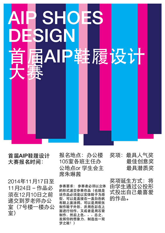首届AIP鞋履设计比赛在11月开始接受报名,2013级,2014级各班的学生都积极参与,截至报名有15名同学参赛,参赛作品会在12月10日之前收集完整。希望通过此次的设计比赛,开发同学们的创意及想象力,通过自己动手,在没有老师的指导情况下,100%运用自己的创意及动手能力设计出一款有趣的鞋子。