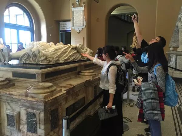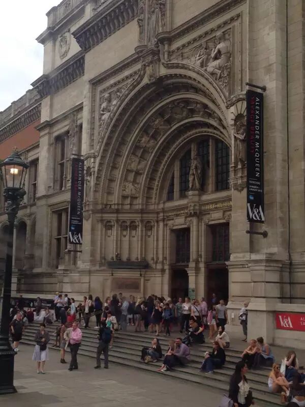 结束了早上的课程,Emma老师带领同学们坐着伦敦火车到达维多利亚与阿尔伯特(Victoria and Albert,简称V&A)观看亚历山大·麦昆(Alexander McQueen) “野性之美 (Savage Beauty) ”服装作品回顾展。此次展览难得一遇,涵盖了McQueen作为英国国宝级服装设计师的辉煌设计生涯。McQueen的作品极具故事性,黑暗而忧郁,却不失华贵,又掺杂些野性的欲望之美,展览现场展示的虽只是服装,而仿佛让同学们看到的是McQueen在对我们叙述他的人生。同学们纷纷折服于McQueen的才能,感叹到,这是让人难以忘怀的一场精彩绝伦的展览,非常幸运能在此次游学看到这场经典的服装作品展!