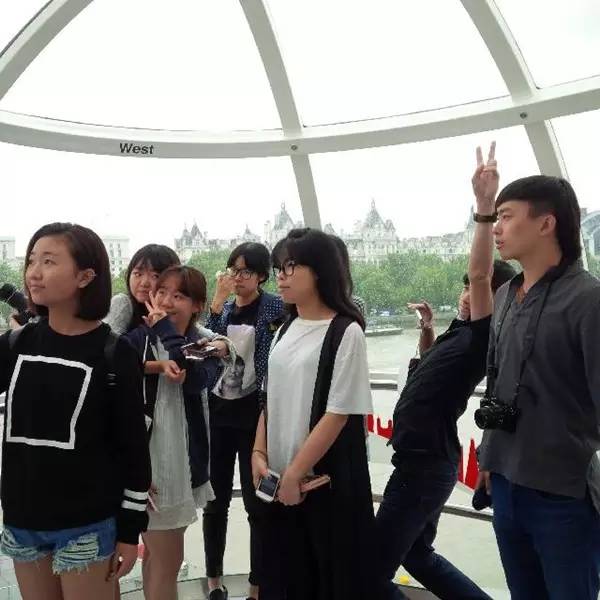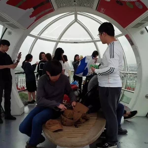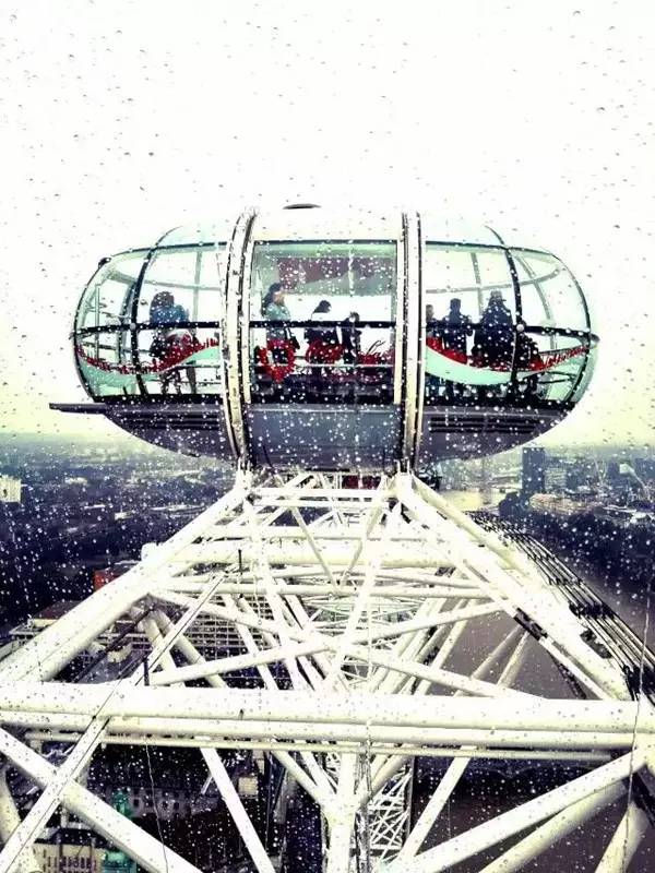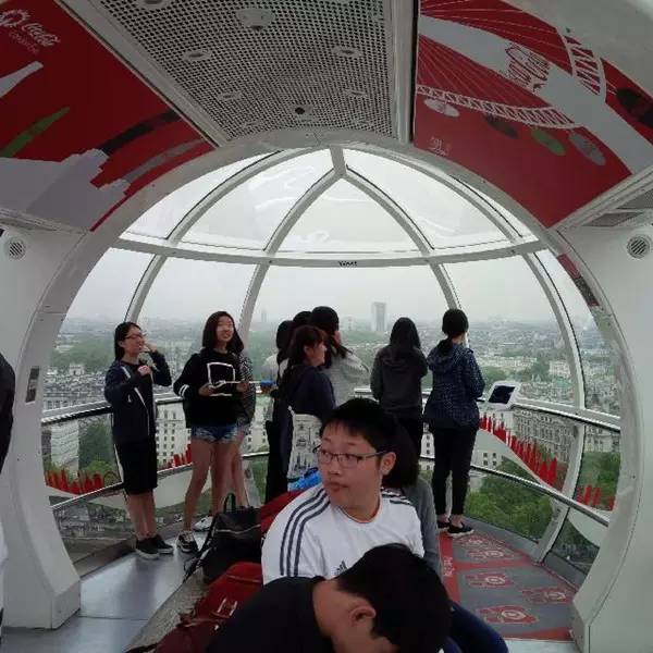 同学们进入乘坐舱,随着伦敦眼缓缓升高,伦敦的景色开始随之缩小,同学们的视线也逐渐放远,在半个小时的旋转中,到达城市中心的上空,整个伦敦美妙的风景尽收眼底,蜿蜒优美的泰晤士河,伦敦各大地标的缩影,远处还依稀可见巴黎的埃菲尔铁塔,伴随雨滴打在乘坐舱的玻璃上,呈现在我们面前的是印象中的雾都。