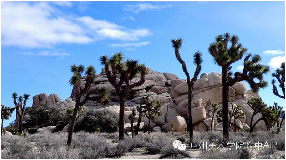 早上吃完早餐后,我们出发前往约书亚树国家公园写生。约书亚树 (Joshua Tree) 被当地人昵称为“J 树” (J-Tree),生长在海拔较高的莫哈韦沙漠 (Mojave Desert) 与海拔较低的科罗拉多沙漠 (Colorado Desert) 交汇处。海拔高低相交使得生态交替区内形成令人惊异的沙漠植物群,其中就包括约书亚树这种外形奇异的树木。约书亚树曾经是当地土著赖以生存的植物,他们用树的叶子来编织鞋和织品,芽和种子则作为食物。这种树在公园内大量分布,所以公园的也以此命名。